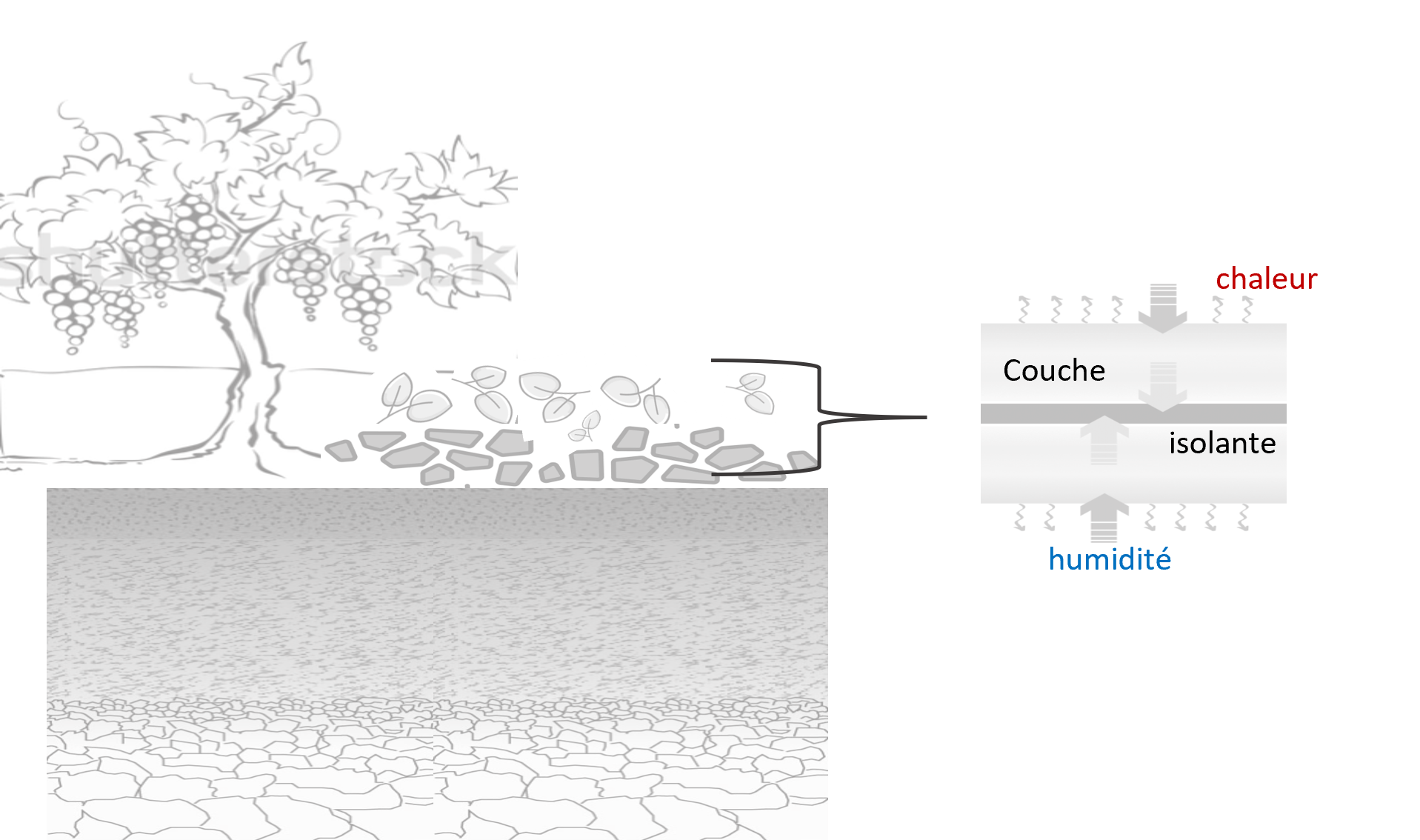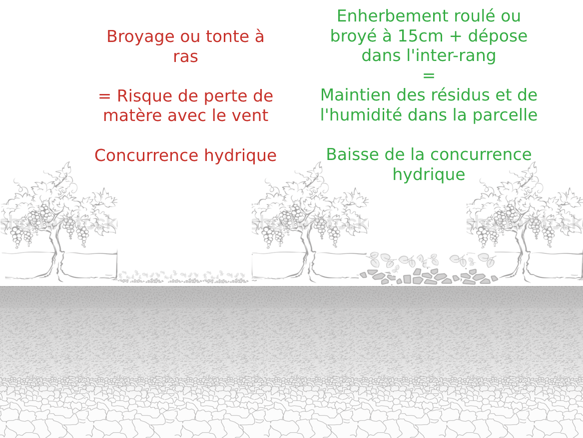 La gestion des sols agricoles avec des résidus de végétaux (ex : paillage, BRF), en comparaison à des sols agricoles nus diminue localement la température de plusieurs degrés mais aussi l’évaporation de l’eau du sol. Ces différences entre un sol couvert de résidus végétaux et un sol nu sont d’autant plus marquées que la période est caniculaire. Le paillage peut-être importé ou issu de l’enherbement sur place. Il sera d’autant plus efficace qu’il sera dispersé à la fois dans l’inter-rang et sous le rang.