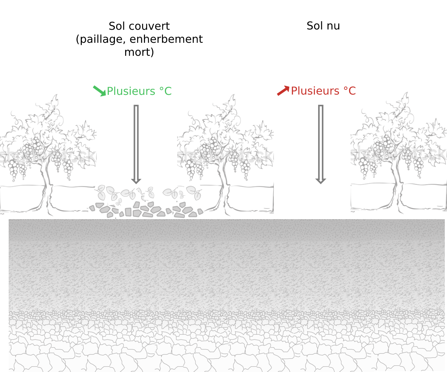 La disponibilité en eau du sol permet de réduire de plusieurs degrés la température du feuillage. En effet, la perte d'eau par les stomates ouverts a un effet de refroidissement sur la végétation et l'environnement. Les expériences menées dans différents vignobles exposés à des vagues de chaleur ont montré de grandes différences de température de la végétation en fonction des quantités d’eau apportées. Les vignes qui transpirent contribueront donc au refroidissement du vignoble. Il est important de commencer à irriguer avant la vague de chaleur pour éviter d’être pris de court lorsque l’évènement arrive. En effet, en général en période de forte chaleur, compenser l’évapotranspiration par une irrigation de dernière minute s’avèrera infructueux.