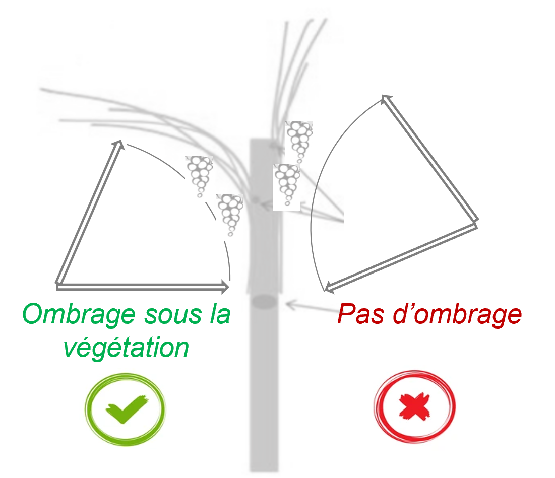 En conclusion : il convient de réduire l'exposition des grappes au rayonnement par un ombrage naturel fourni par la végétation, de préférence à réfléchir tôt dans la saison. Aussi, au moment de la plantation, il est conseillé d’inclure dans la réflexion la réduction du rayonnement sur les grappes par l'orientation des rangs (privilégier E/O), le système de conduite, un palissage adapté ou des techniques d'ombrages.